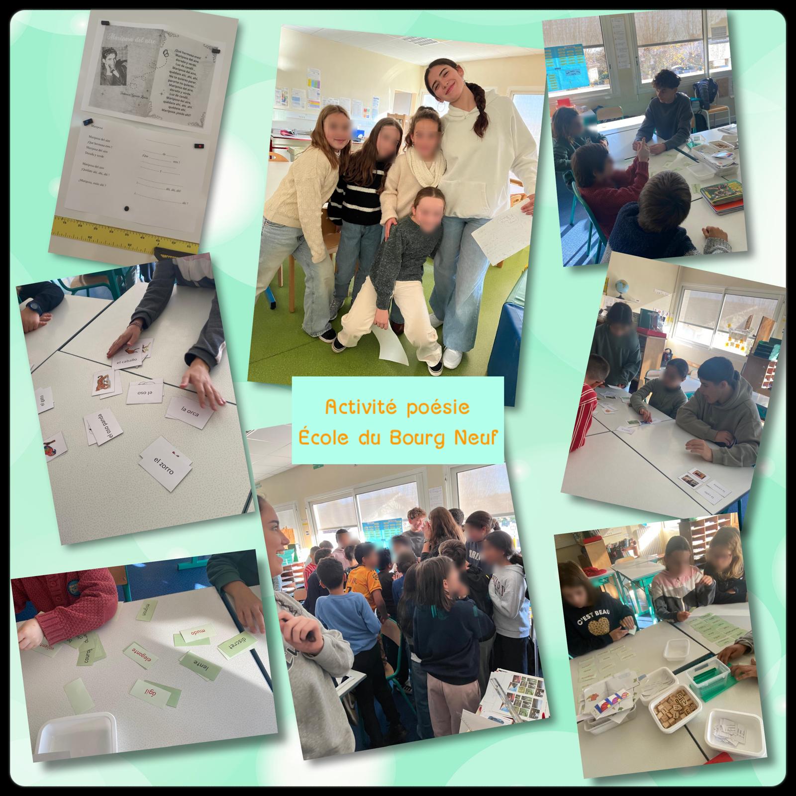 - Après-midi : animation d’un atelier poésie à l’école primaire du Bourg-Neuf, où les élèves espagnols ont accompagné les CM2 dans la rédaction de poèmes inspirés de « Mariposas del aire » de Federico García Lorca.
