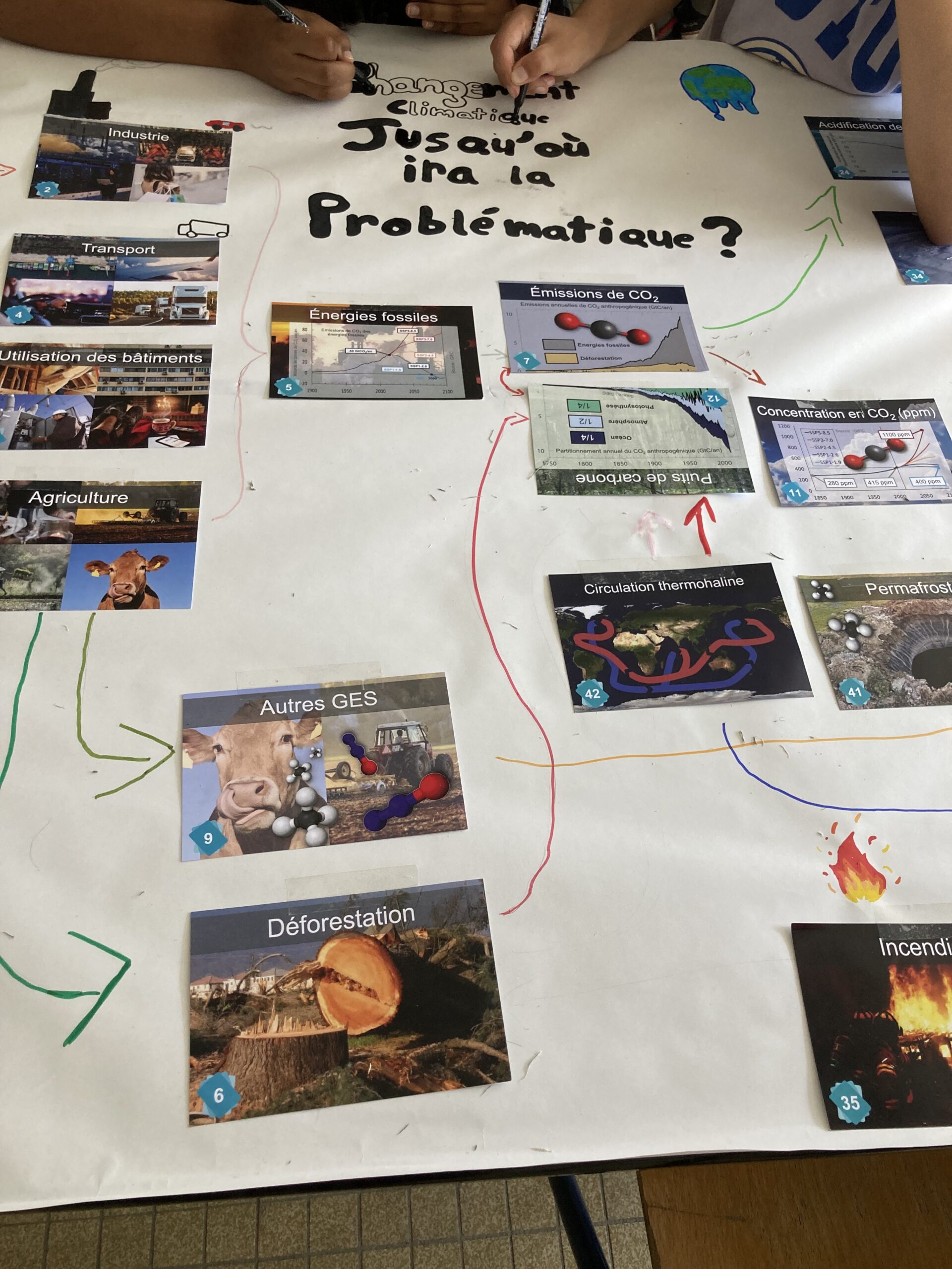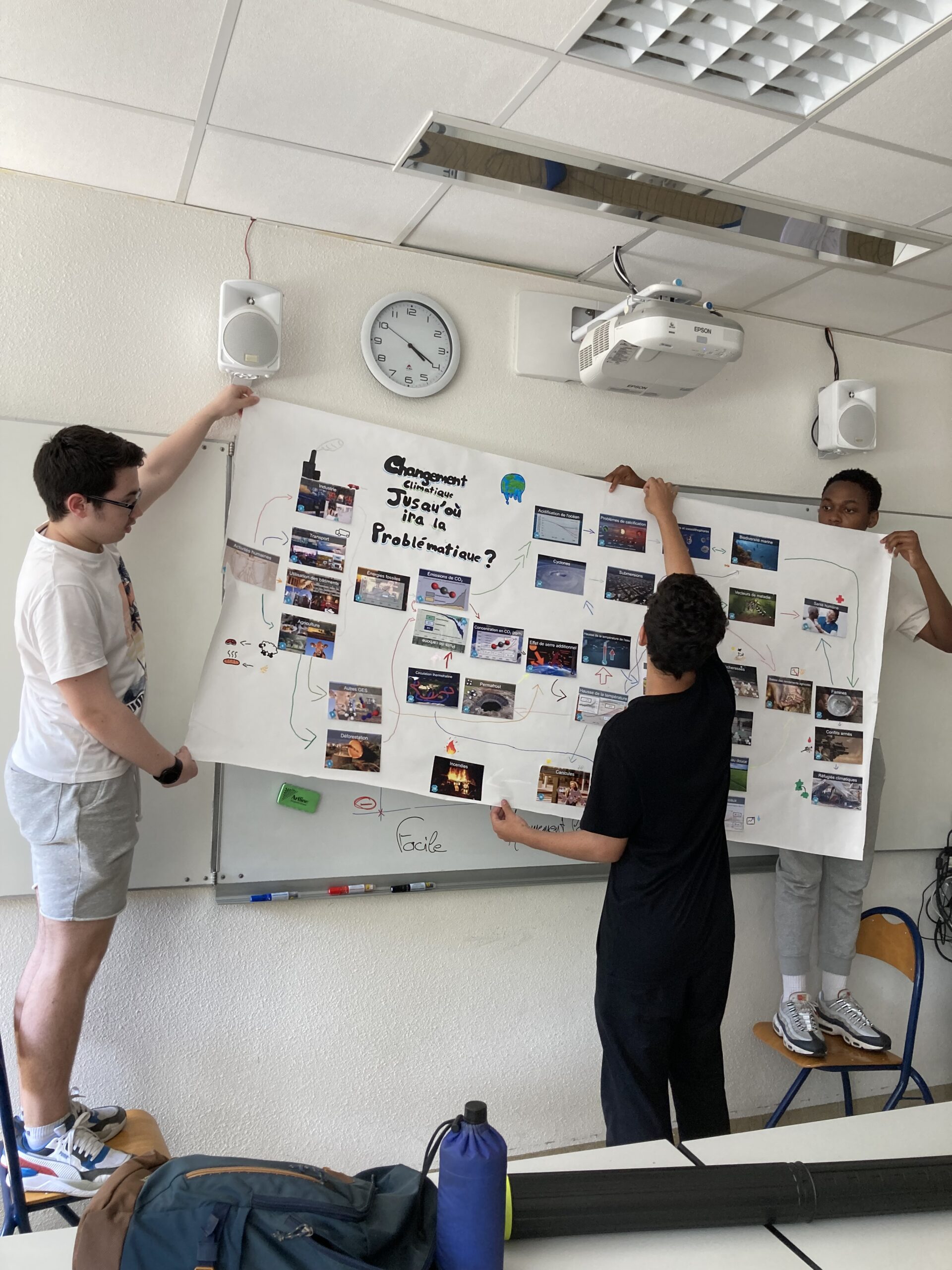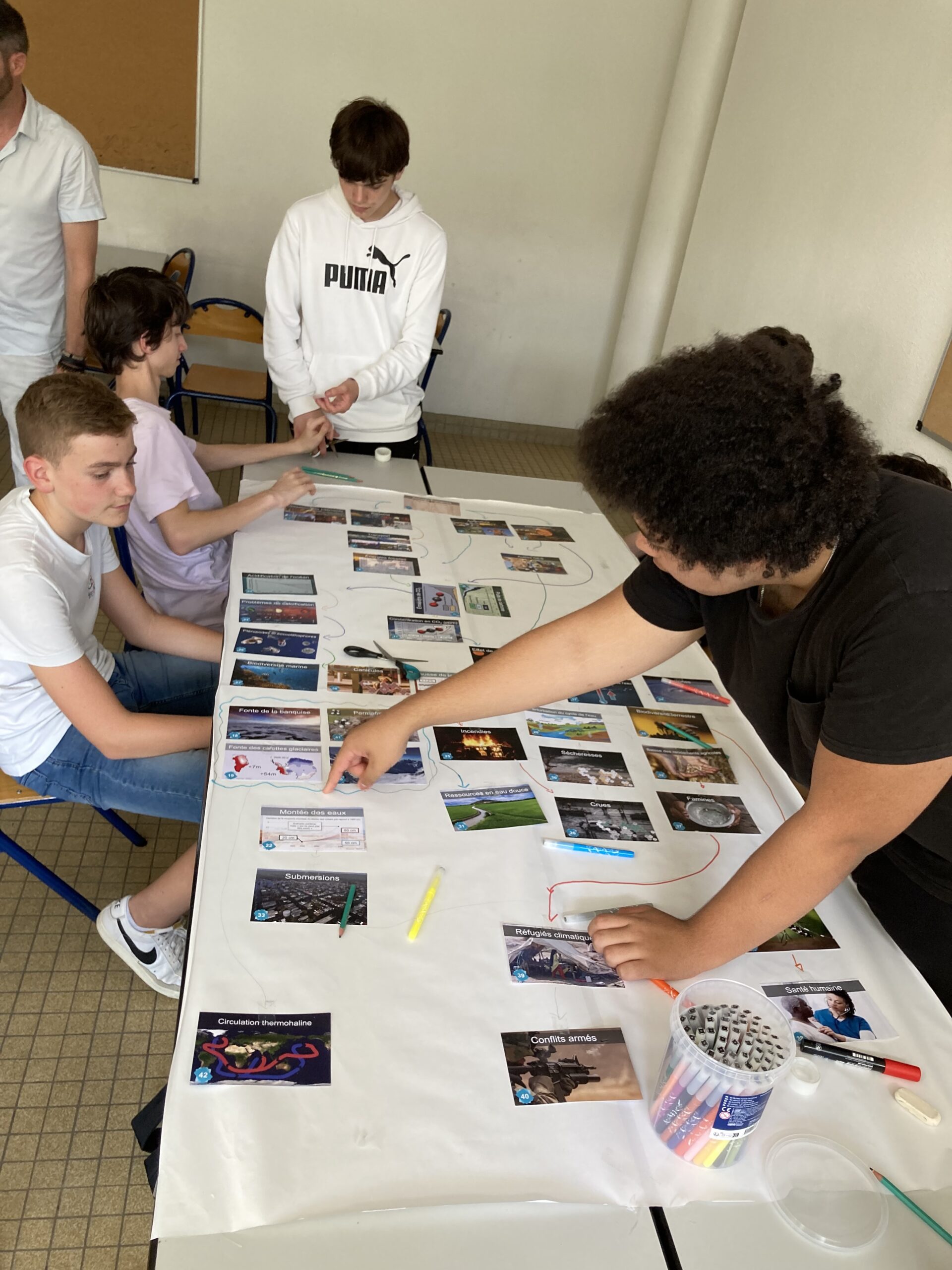 Grâce au dispositif « Pass culture », la classe de 2de10 du Lycée V. Duruy a pu collaborer et créer sa fresque du climat grâce à l’intervention de M. Olivier Barrière. A partir d’un jeu de cartes explicatives basées sur les derniers rapports du GIEC, de nombreuses problématiques liées au changement climatiques sont abordées et doivent être mise en corrélation (liens de causes/conséquences et rétroaction) par chaque groupe d’élèves qui, au fur et à mesure de leurs échanges, construisent ensemble leur fresque du climat.