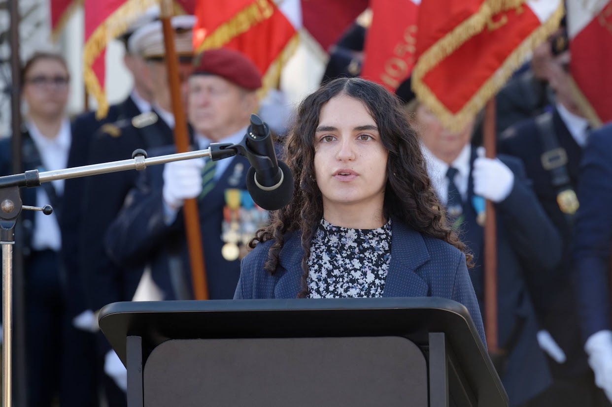 Lilou Darmandieu (classe de 1ère) a lu le texte officiel de l’UFAC et nos 2 porte-drapeaux étaient présents, avec William Ryba et Inaya Lakhal (classes de terminales). Le papa d’Inaya avait aussi décidé de se joindre à la délégation du lycée, en tant que porte-drapeau.