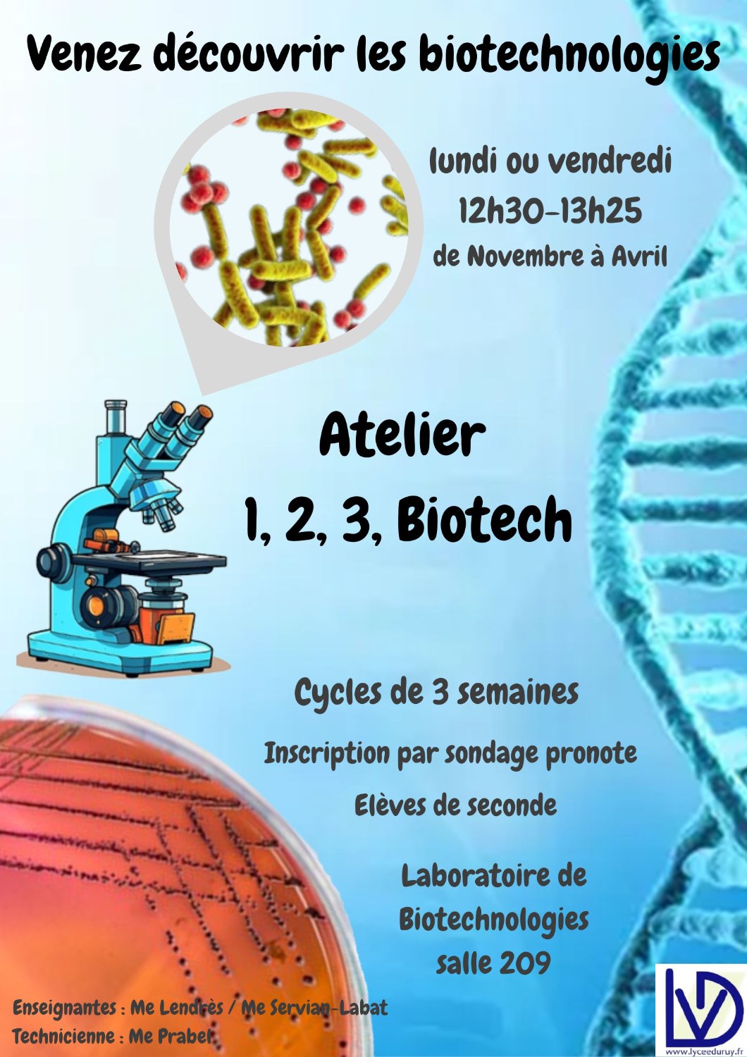 A destination des élèves de seconde, il vise à offrir une opportunité de découvrir les biotechnologies par la réalisation d’expérimentations au laboratoire, au cours d’un ou plusieurs cycles de 3 semaines.